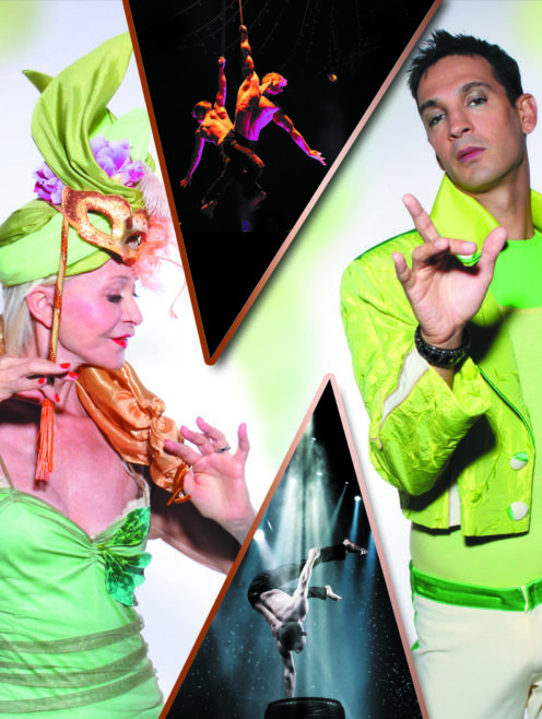SchwarzBlond mit Artisten-EnsembleDas Winter Varieté Spektakel mit grandiosen internationalen Artisten, die sich verbiegen, jonglieren, die Welt auf einem Arm erkunden oder andere höchst außergewöhnliche Dinge tun. Von Monella Caspar selbst entworfener Haute Couture und der vier Oktaven Stimme von Benny Hiller, die das Eis zum Klirren bringt: